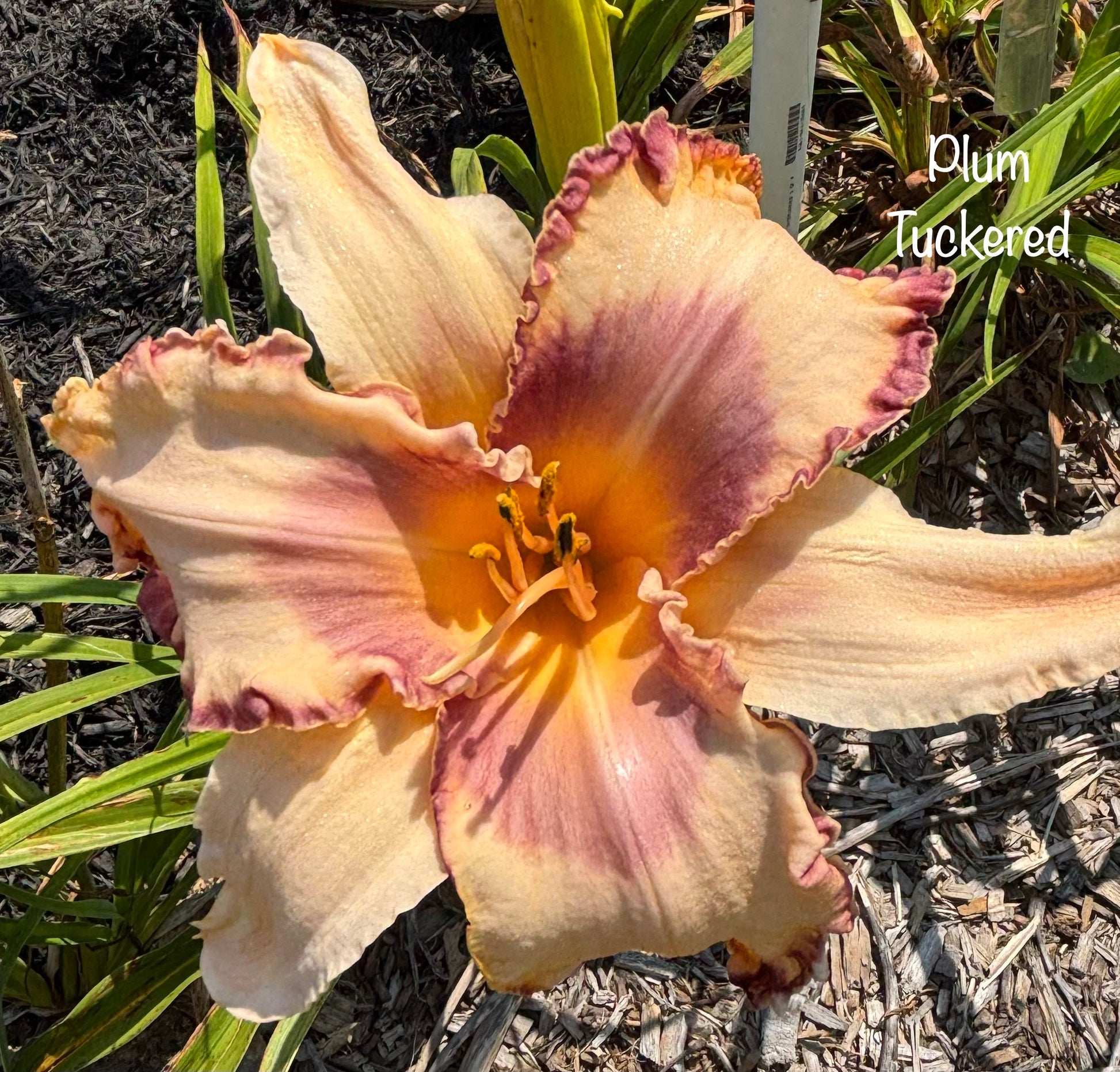 Color Desc: Peach With Chevron-Shaped Plum Eye, Yellow To Green Throat And Wide Plum Edge Outlined With Gold